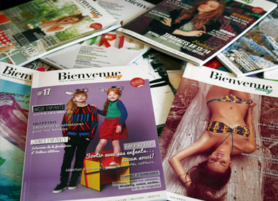 Création et réalisation de l'identité visuelle du magazine Bienvenue mag: Logo, papeterie, maquette, gestion du site internet.